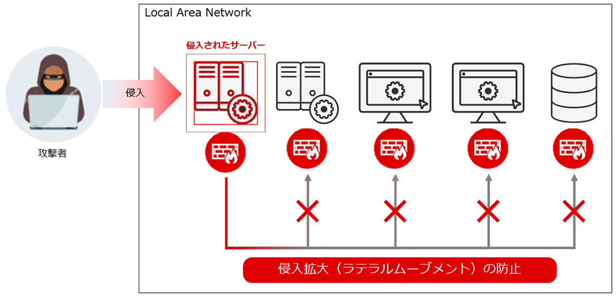 従来は、境界型防御(システムの出入口での対策)が主流でしたが、本メニューを利用することで、システム内部に侵入した脅威の拡大を防ぐ「ラテラルムーブメント(水平方向)対策」が実現でき、昨今の高度化するサイバー攻撃対して、より堅牢なセキュリティ対策が可能となります。